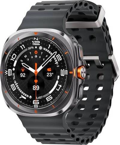 Samsung Galaxy Watch Ultra в корпусе Titanium Gray и ремешке Marine/Dark Gray (M/L) — это сочетание строгости и технологичности. Большой экран диагональю 47 мм обеспечивает отличную читаемость, а цветовая гамма подчеркивает солидность и функциональность.