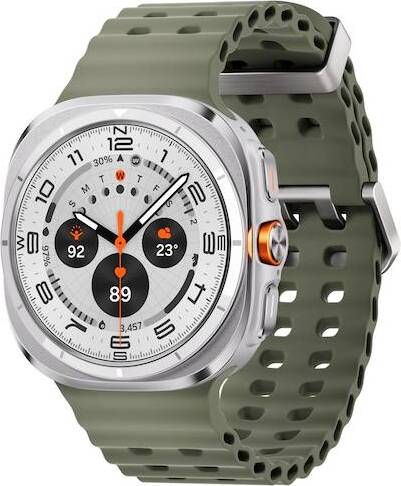 Samsung Galaxy Watch Ultra Titanium White — умные часы премиум-класса с крупным экраном диагональю 47 мм , выполненными в элегантном исполнении: корпус Titanium White и яркий ремешок Marine/Green (M/L).